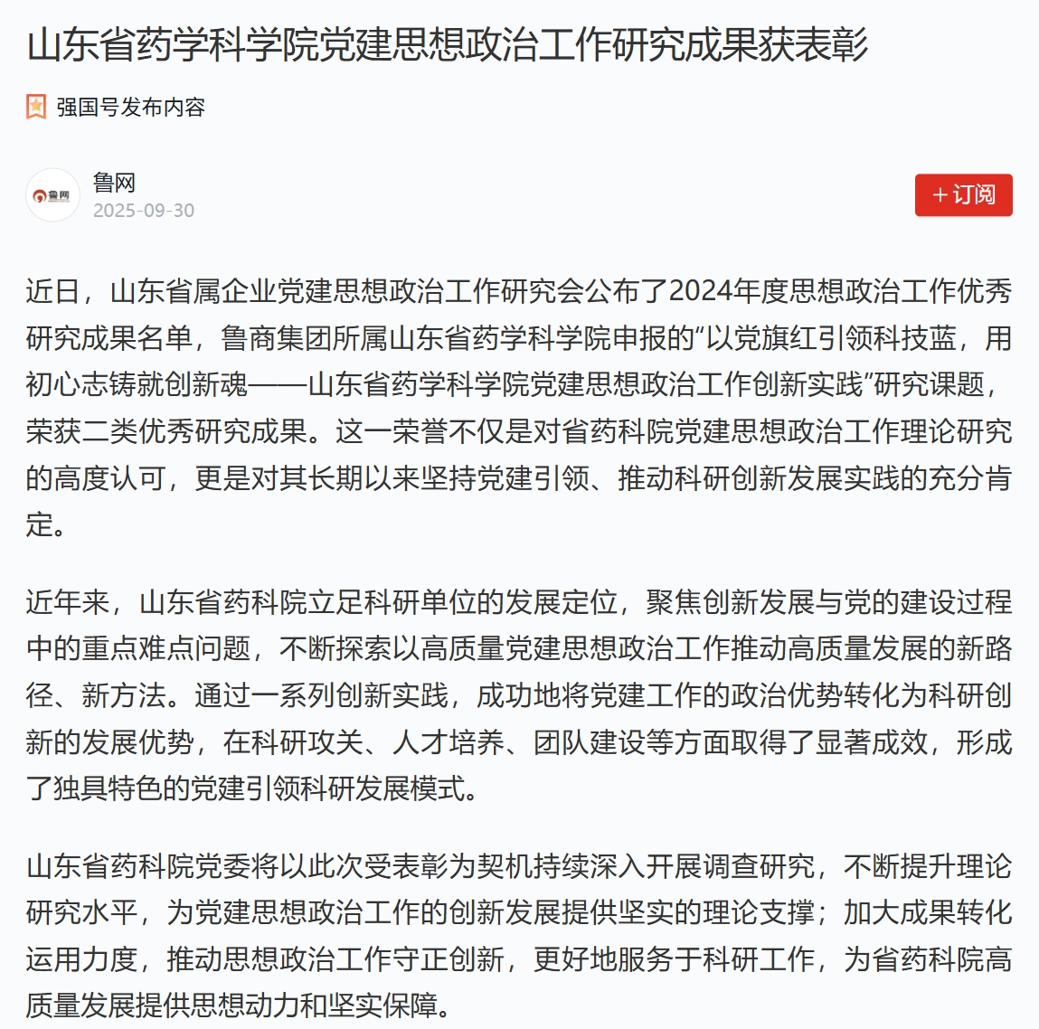 山东省药学科学院党建思想政治工作研究成果获表彰...